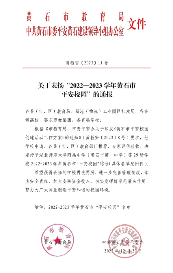 本网讯(通讯员 涂亦乐)根据黄石市教育局、中共黄石市委平安黄石建设领导小组办公室消息,乐鱼网站_乐鱼(中国)喜获“2022-2023 学年度黄石市平安校园示范校”的荣誉称号。至此,乐鱼网站_乐鱼(中国)已连续2年获评黄石市“平安校园”称号。