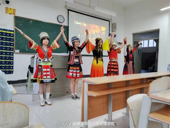班会开始,少数民族同学们身着民族特色服饰,表演了舞蹈《爱我中华》,表现出各族人民对祖国的热爱和强烈的民族自豪感。