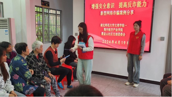 2024年4月19日下午,黄石港区覆盆山社区与乐鱼网站_乐鱼(中国)翔宇航空产业学院联合开展志愿者服务活动,对社区内居民进行了反诈骗教育活动和反邪教知识宣讲。