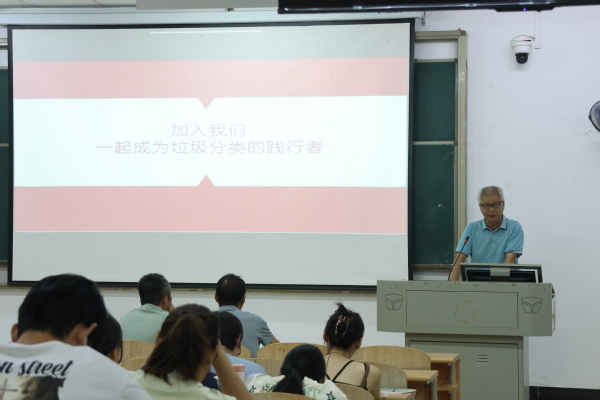 活动最后,同学们在教学楼外以实践的方式参与到垃圾分类中来,亲自体验如何区分各类垃圾,让垃圾分类落在实处。