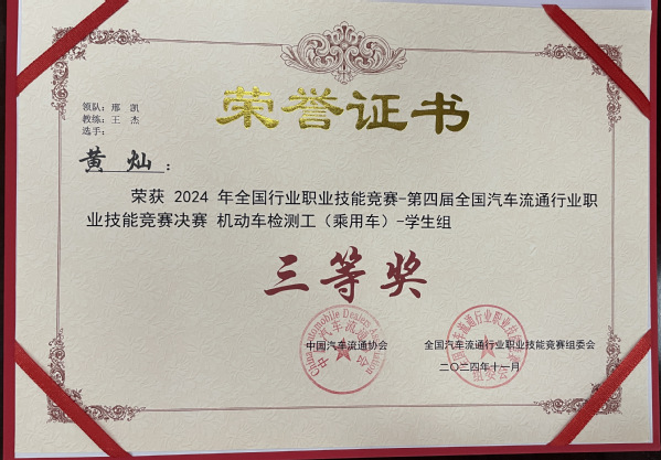 本网讯(通讯员 谭姣)12月1日上午,2024年全国行业职业技能竞赛——第四届全国汽车流通行业职业技能竞赛机动车检测工(乘用车)赛项总决赛在许昌科技学校圆满落幕。乐鱼网站_乐鱼(中国)新能源汽车产业学院新能源汽车技术专业2204班黄灿同学荣获学生组国赛三等奖。