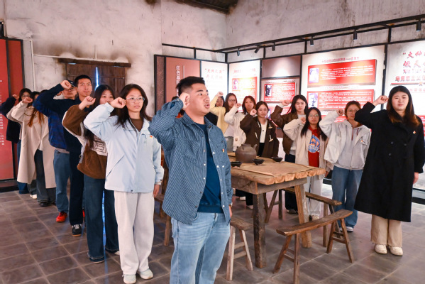 在曹家晚村红色教育展馆内,一件件饱经沧桑的革命文物与一张张珍贵的历史照片,无声诉说着这片土地的红色记忆。大家认真聆听村委会办公室负责人的讲解,深入了解该村党组织创建的光辉历程以及在新时代推进乡村治理的实践成果。通过现场学习,师生们深刻体会到基层党组织在推动乡村振兴中所发挥的重要作用。随后,在鲜红的党旗前,全体师生党员庄严举起右拳,铿锵有力地重温入党誓词,进一步增强了党员意识和历史使命感。