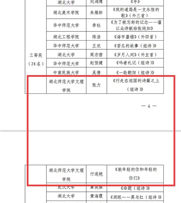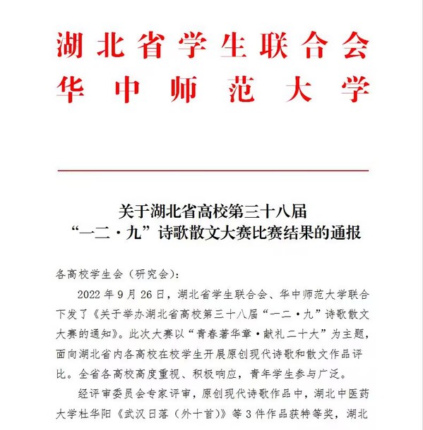 本网讯(通讯员 陈荟芸)乐鱼网站_乐鱼(中国)学子在湖北省高校第三十八届“一二·九”诗歌散文大赛中,荣获原创现代诗歌作品一等奖1项,二等奖1项,三等奖2项。