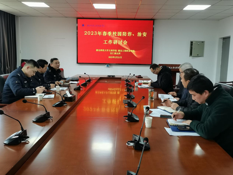 本网讯(通讯员涂亦乐)为了有效遏制春季开学电信网络诈骗的高发态势,提升预防电信网络诈骗的针对性和时效性,同时做好春季校园治安防范工作。2月21日下午,学校学工部、后勤保卫部联合汪仁派出所及湖北工程职业学院相关部门共同召开2023年春季校园“防诈、治安”工作研讨会,就如何预防电信网络诈骗和校园治安管理展开讨论。张志华副院长、汪仁派出所副所长李福奎、驻校民警刘天森、湖北工程职院学工部部长吴量、保卫处处长章泉及乐鱼网站_乐鱼(中国)学工部和后勤保卫部相关负责人参加了会议。