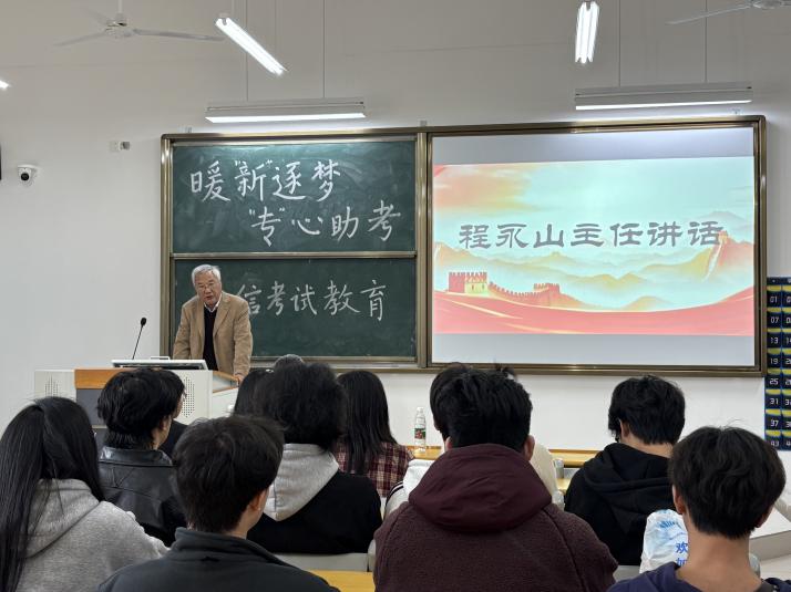 会上,程永山主任代表全体教师向备考学生表达了深切关怀与殷切期望,充分肯定了同学们在备考阶段的辛勤付出,并鼓励大家以积极心态迎接挑战。程主任在发言中向同学们提出了三点殷切期望,他鼓励大家要树立必胜信心、保持平常心态以及要坚守进取之心,暖心的话语让在场学子倍感振奋。同时程主任还严肃强调了考试纪律,叮嘱道:“诚信是立身之本,考试成绩固然重要,但诚信品质更为珍贵。希望同学们以真才实学作答,交出一份无愧于心的答卷。”