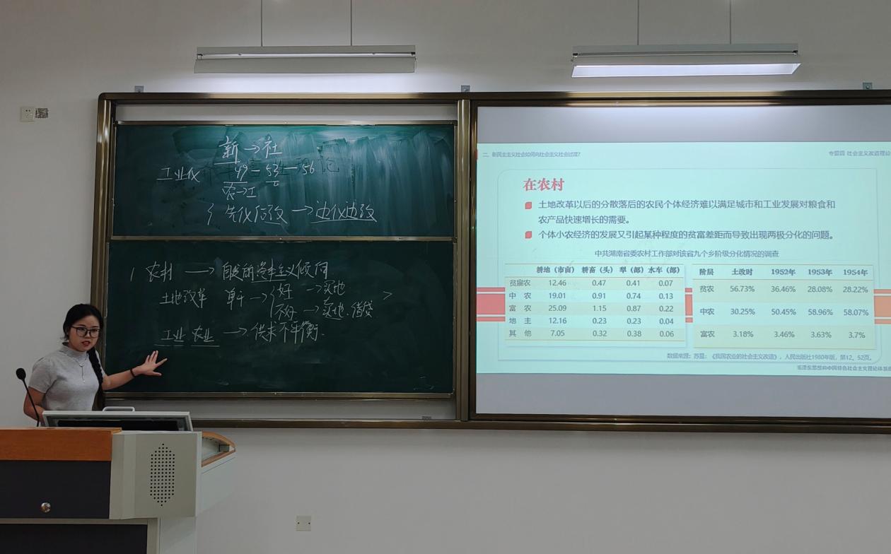 思政组唐见平、邓小钇、刘茜、陈文丽老师,分别以“新民主主义社会如何向社会主义过渡?”“鸦片战争前后的中国与世界”“从《大决战》看新民主主义革命理论的历史实践”“新发展格局——应变局开新局的战略选择”为题进行教学展示。比赛过程中,四位青年教师通过精心的讲解、富有感染力的语言表达,普遍表现出较强的课堂驾驭能力,同时展现了各自的教学特色。
