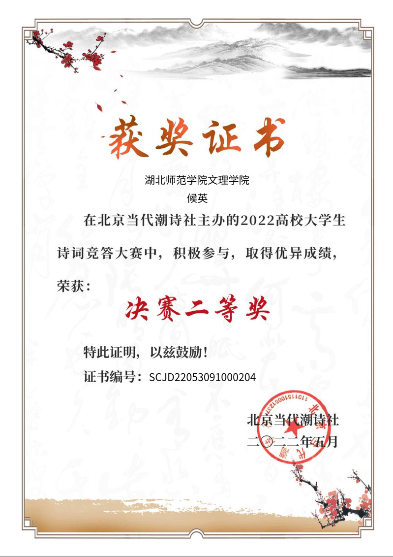 侯英同学在2022高校大学生诗词竞答大赛中荣获决赛二等奖