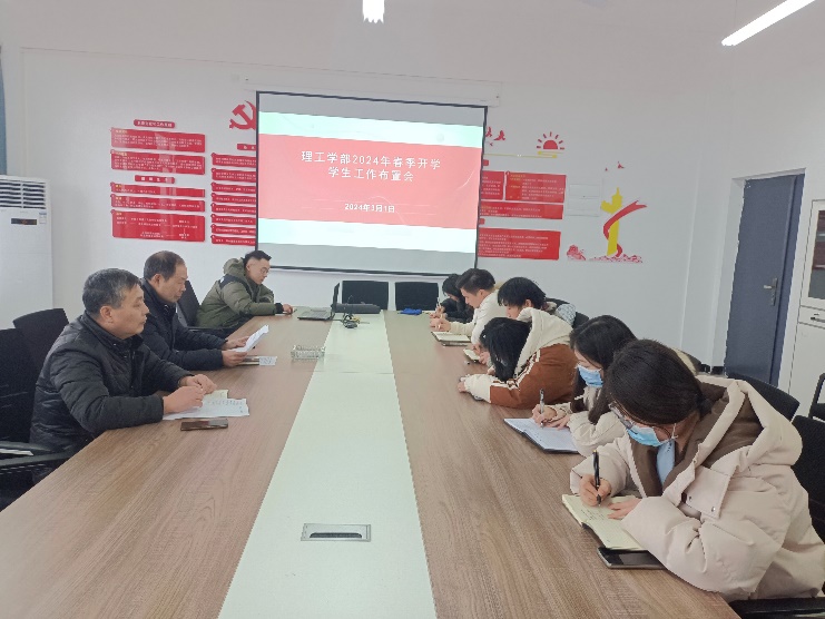 2024年3月1日下午,乐鱼网站_乐鱼(中国)理工学部在4#311会议室召开全体辅导员会议,学习传达学校2024年春季干部大会会议精神并部署新学期工作。会议由学工办副主任张弛老师主持,学部主任傅朝金、学部党总支副书记肖圣芳及全体辅导员参会。