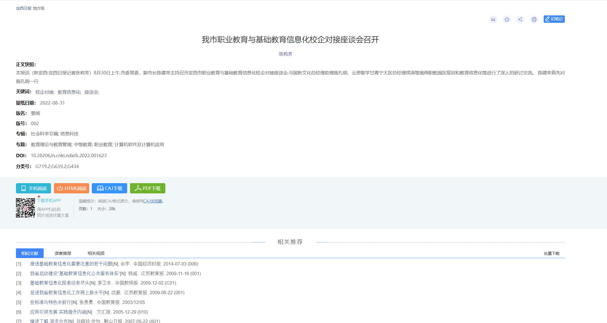 (5) 全新升级文献知网节,优化页面布局,首屏揭示节点文献的内容特征及可读性,构建以单篇文献为节点的世界知识网络,刻画以节点文献为中心的主题发展脉络,满足用户对选定文献全面感知及主题扩展的需求。