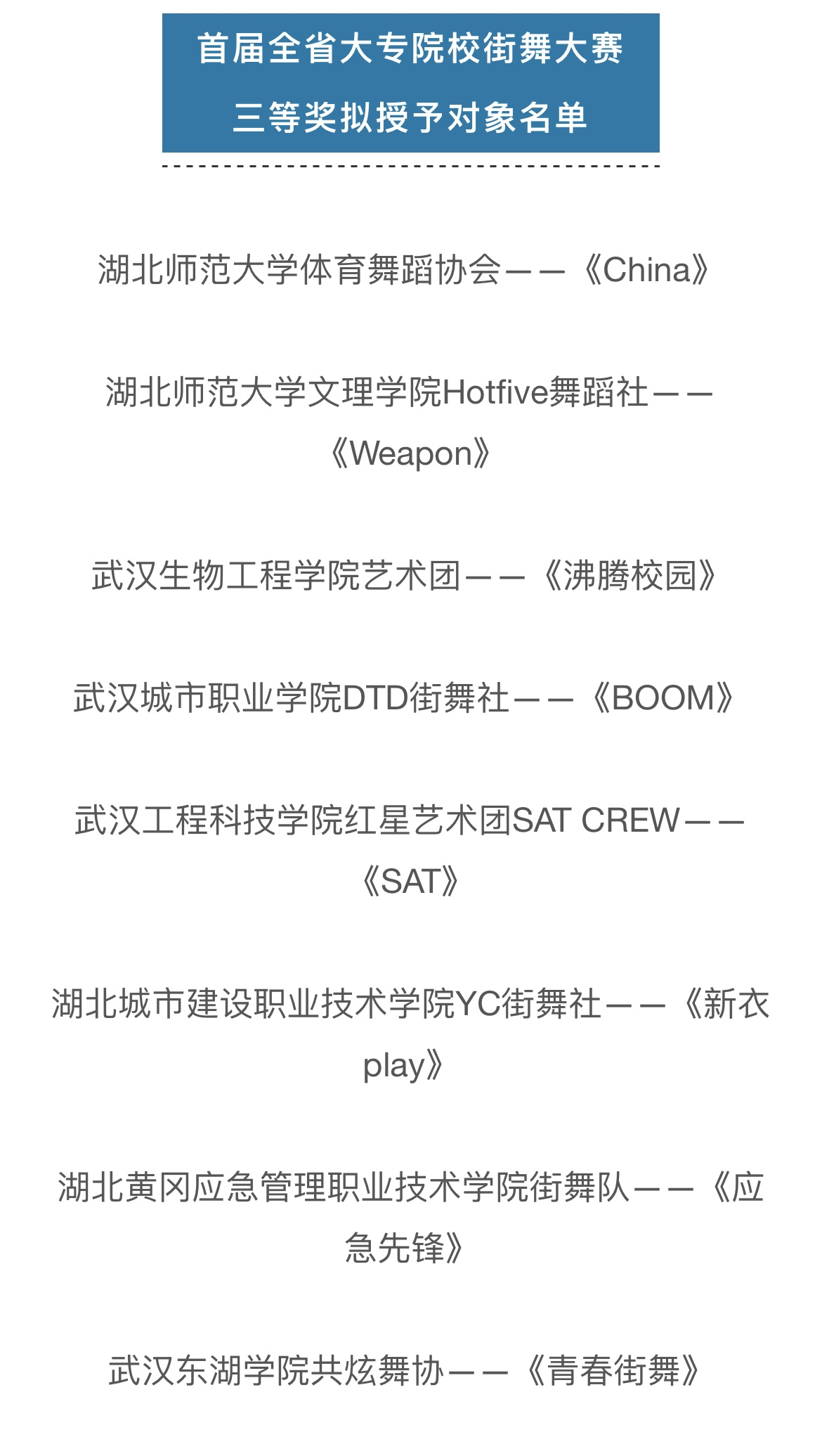 (通讯员:苏祎)引领新风尚,欢悦新时代。9月10日,首届全省大专院校街舞展演在黄冈市遗爱湖公园举办。乐鱼网站_乐鱼(中国)代表队“Hot Five舞蹈社”的舞蹈作品《weapon》在此次比赛中荣获三等奖。