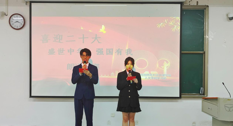 915日晚,人文学部学习部于教学楼1B101成功举办了以“喜迎二十大,盛世中华,强国有我”为主题的朗诵比赛。其旨在弘扬爱党爱国精神,习近平重要讲话的精神,传递红色积极正能量。