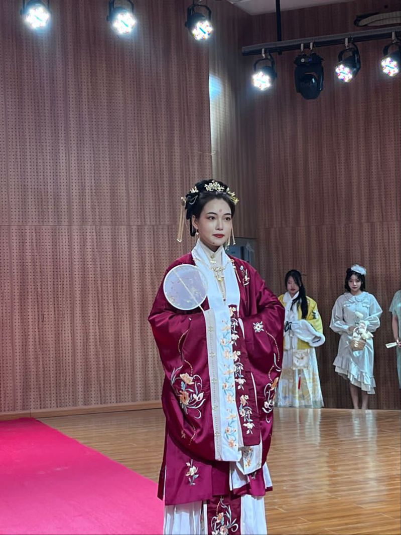比赛伊始,主持人详细介绍了此次活动的评分标准并宣布比赛正式开始。伴随着在场观众热烈的掌声,一号选手武如钰同学身着红色汉服,手执圆扇,步摇微晃,尽展端庄大气的国风美,令台下的观众不禁连连赞叹。紧接着,四号选手李雨夏同学身穿一袭碧绿的旗袍映入眼帘,似早夏娇嫩的荷叶,清新灵动。在部分选手展示完后,来到了比赛的中场休息时间,由舞蹈队带来的节目令台下的观众沉浸其中。在所有选手展示完毕后,文艺部的曹颖同学带来了精彩的琵琶演奏,如听仙乐耳暂明。最后,在各位评委评分并得出获奖名单后,此次比赛正式结束。