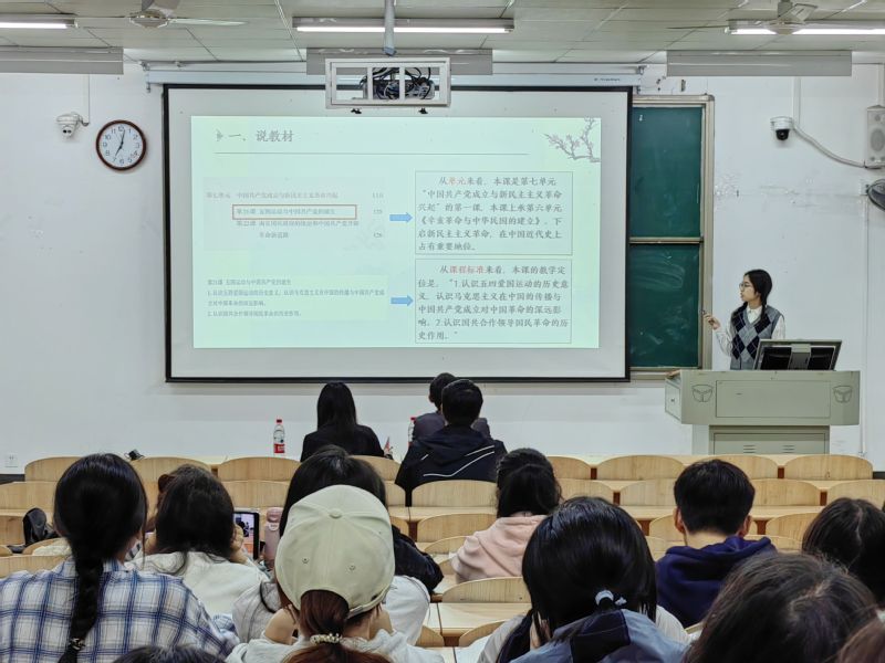 比赛过程中,历史组的一号选手李若熙同学生动的讲述了觉醒年代的故事,再现那个不平凡时代的社会状况和百态人生。语文组二号选手向俞锦同学在讲《落花生》时,将默默无闻、无私奉献的“花生”形象的比作我们日常生活中随处可见的环卫工人、食堂阿姨、老师等等。英语组的选手们口语流利,各放异彩,例如,一号选手吴林芝同学讲的是八年级下册的"What is the matter?",该选手语速适中,课件内容完善,较好的呈现了说课内容。最后是比赛的点评环节,评委老师们对各组选手的表现进行了认真细致的点评,并一一提出了宝贵的改进意见。