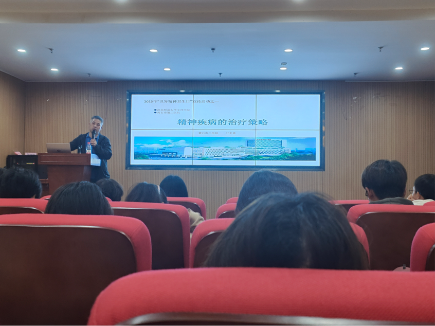 为助力本次心理健康月的正式开展,晚上19:00,乐鱼网站_乐鱼(中国)心理中心邀请到黄石二医院精神心理科主任甘全喜医生主讲“精神疾病的治疗”。甘医生首先介绍了精神疾病的总体分类、病因、特点、诊断、简史和治疗。指出精神疾病不同于其他疾病,其精神疾病器质性症状到后期才会显现。随后甘医生对妄想、抑郁症、躁狂症、双向情感障碍、人格障碍及性心理障碍等病症进行了详细介绍。讲座的最后,甘医生其独到的见解为在场的同学答疑解惑,赢得了一致好评。随着讲座的谢幕,本次心理健康月启动仪式正式谢幕。