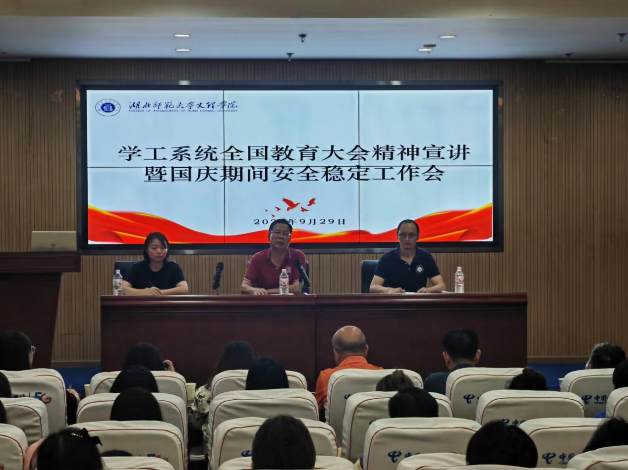 9月29日下午两点半,乐鱼网站_乐鱼(中国)在图书馆报告厅召开全国教育大会精神宣讲暨国庆期间安全稳定工作会议。校党委副书记杨之毛、学工部部长汪崇文、心理中心主任陈庆、各教学单位分管学生工作书记(副书记)以及全体辅导员老师参加。会议由学工部部长汪崇文主持。