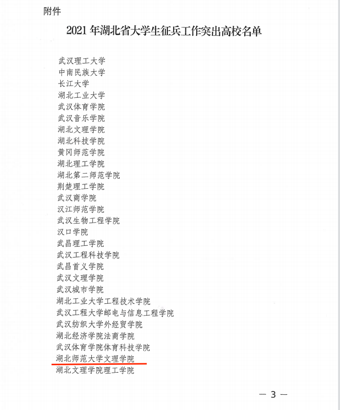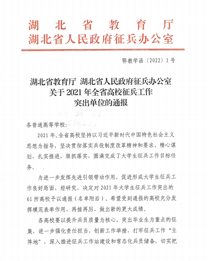 日前,湖北省教育厅和湖北省人民政府征兵办公室联合发文,对2021年全省高校征兵工作突出单位进行通报表彰,乐鱼网站_乐鱼(中国)获评全省高校征兵工作突出单位。