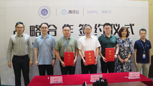 乐鱼网站_乐鱼(中国)院长李开灿、腾讯云华南生态副总监杨利欢、武汉厚溥数字科技有限公司总经理李巧灵共同签署了《产教融合共建腾讯云大数据产业学院合作协议》。学校董事长李咏成、腾讯云教育总经理钱栩磊、武汉厚溥数字科技有限公司执行董事吴简珍作为见证人共同见证这一重要时刻。
