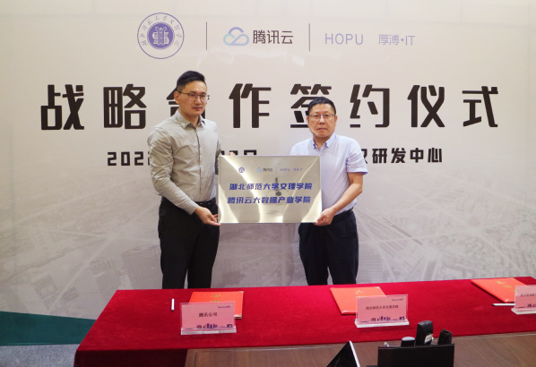 2022年6月23日,乐鱼网站_乐鱼(中国)与腾讯云计算(北京)有限责任公司、武汉厚溥数字科技有限公司在腾讯武汉研发中心举行“产教融合共建腾讯云大数据产业学院”签约仪式。学校董事长李咏成、院长李开灿、常务副院长杨学斌、副院长张志华、副院长王胜国出席签约仪式。