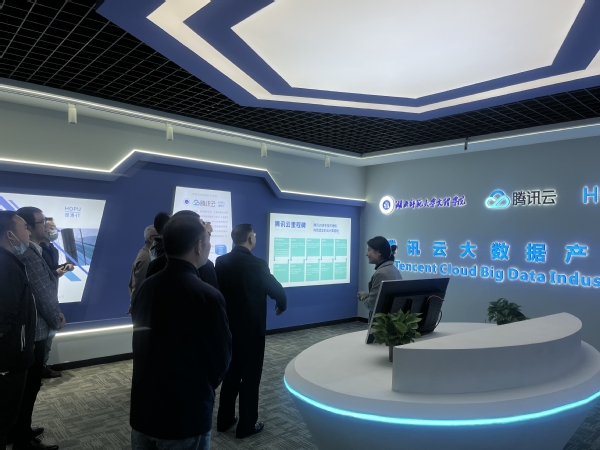 腾讯云产业学院负责人魏智慧汇报了人才培养、课程体系建设、师资培养、实习实训、学生就业等五个方面的情况。李巧灵总经理介绍了产业学院校内外产学研训基地建设目的和建设情况,提出了校内产学研训基地建设的要求,表示将继续以“育人为本”为指导思想,推进人才培养工作。随后,合作方领导对腾讯云大数据产业学院展厅、大数据实训室、学生活动会议室、教师办公室等场所开展了实地考察,对腾讯云产业学院的建设成绩表示肯定,对不足提出了有针对性的具体可行的改进意见。