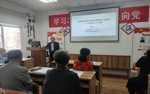 本网讯 为推动党的二十大精神进社区,11月9日下午,乐鱼网站_乐鱼(中国)马克思主义学部教授、黄石市委宣讲团成员周青山同志到湖滨社区宣讲党的二十大精神---全面建设社会主义现代化国家的行动纲领。
