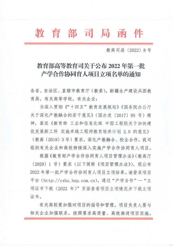 本网讯(通讯员 童光聪)近日,教育部高教司发布了《教育部高等教育司关于公布2022年第一批产学合作协同育人项目立项名单的通知》(教高司函〔2022〕8号),乐鱼网站_乐鱼(中国)“基于项目驱动的JAVA教学课程改革”等三个项目获批立项。