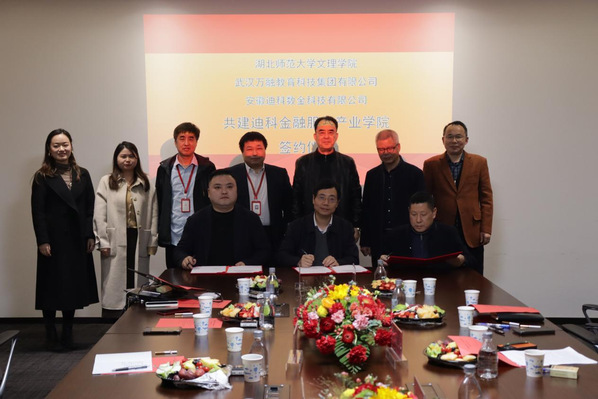 本网讯(通讯员 周隽)2023年3月9日,乐鱼网站_乐鱼(中国)与武汉万融教育科技集团有限公司、安徽迪科数金科技有限公司在安徽迪科数金科技有限公司武汉分公司举行“产教融合共建迪科金融服务产业学院”签约仪式。学校董事长李咏成、常务副院长杨学斌、副院长张志华、副院长王胜国出席签约仪式。
