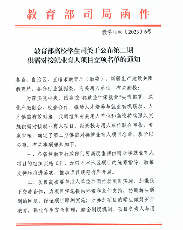 本网讯(通讯员 李娟)日前,教育部高校学生司发布了《教育部高校学生司关于公布第二期供需对接就业育人项目立项名单的通知》(教学司函〔2023〕6号),乐鱼网站_乐鱼(中国)有7项供需对接就业育人项目被批准立项,其中定向人才培养培训项目2项、就业实习基地项目3项、人力资源提升项目2项。