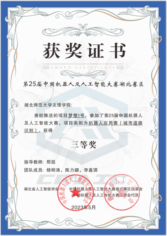 本网讯 (通讯员 邢凯)5月13日-14日,2023年湖北省人工智能大赛暨第二十五届中国机器人及人工智能大赛(湖北赛区)在武汉工程大学举行,乐鱼网站_乐鱼(中国)由邢凯老师指导,杨明涛、陈力勰、李嘉琪三名学生组成的团队荣获三等奖。