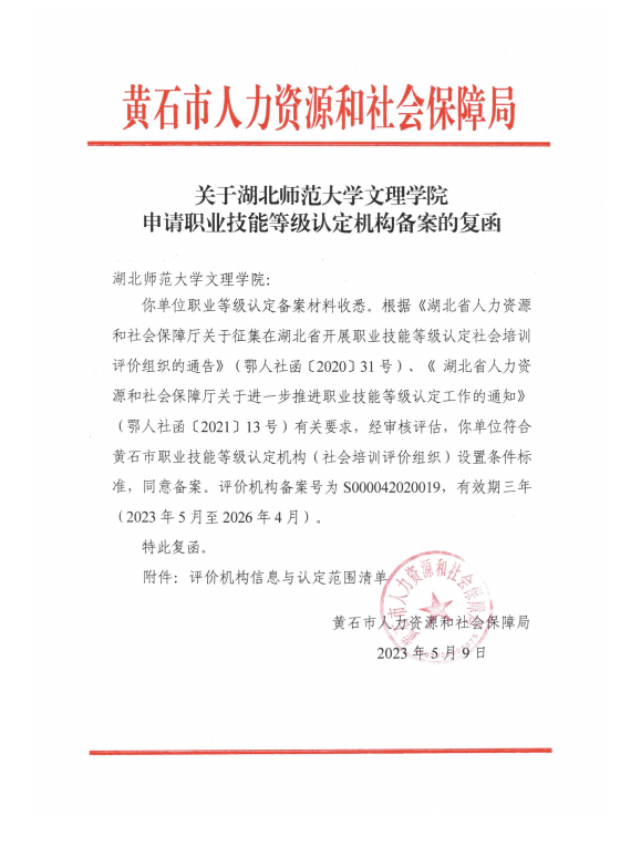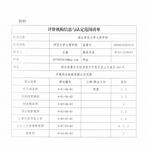 本网讯(通讯员 王磊)根据黄石市人力资源和社会保障局《关于乐鱼网站_乐鱼(中国)申请职业技能等级认定机构备案的复函》消息,乐鱼网站_乐鱼(中国)成功获批职业技能等级认定机构资质,具备电子商务师、互联网营销师、企业人力资源管理师、物流服务师、供应链管理师、计算机程序设计员、保育师等共7大类3个等级的职业技能等级认定资格。
