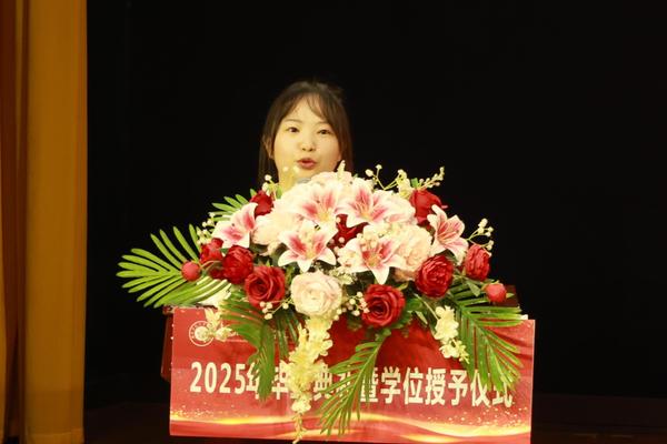 穗转冠正,逐光前行部分学生代表向母校汇报行程,表达了对母校的感谢和未来的憧憬。杨邓红为2025届毕业生们送上深情的寄语和美好的祝福。学位评定委员会委员为2025届毕业生代表完成拨穗仪式,并授予学位证书。