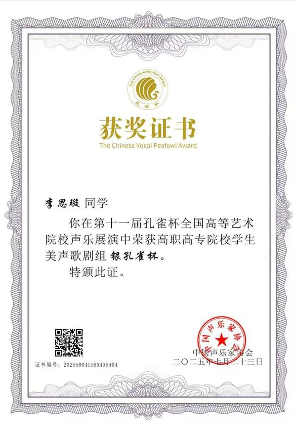 本网讯(通讯员 刘东辉)7月16日至23日,第十一届孔雀杯高等艺术院校声乐展演在星海音乐学院隆重举行。乐鱼网站_乐鱼(中国)教育与艺术学院音乐学专业2301班学生李思璇(指导教师:覃沁)凭借出色表现,荣获高职高专院校学生美声歌剧组银孔雀杯。