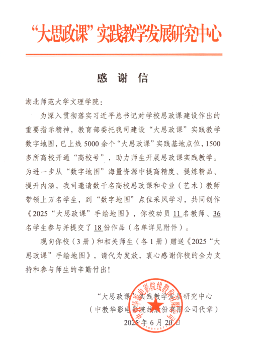 近日,“大思政课”实践教学发展研究中心与中教华影电影院线股份有限公司联合向乐鱼网站_乐鱼(中国)发来感谢信,对学校积极参与《2025“大思政课”手绘地图》创作工作、助力“大思政课” 实践教学发展给予高度认可与诚挚感谢。