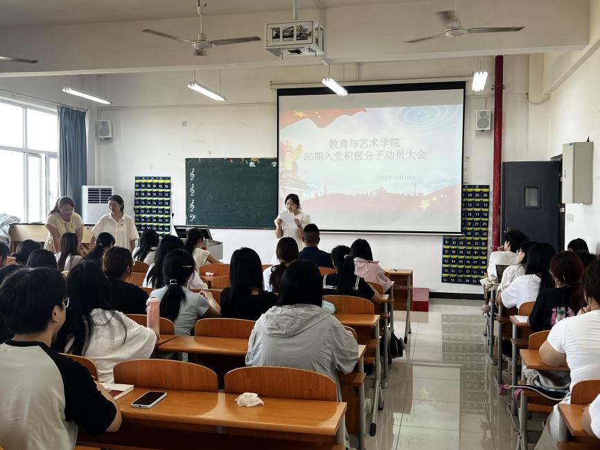 为切实做好入党积极分子培养教育工作,教育与艺术学于院2025年10月10日中午12:00在1-401召开第36期入党积极分子动员大会。党总支副书记陈小龙,学生党支部书记孙盼蕊、学生党支部副书记崔子鲜及全体第36期入党积极分子共同参与。